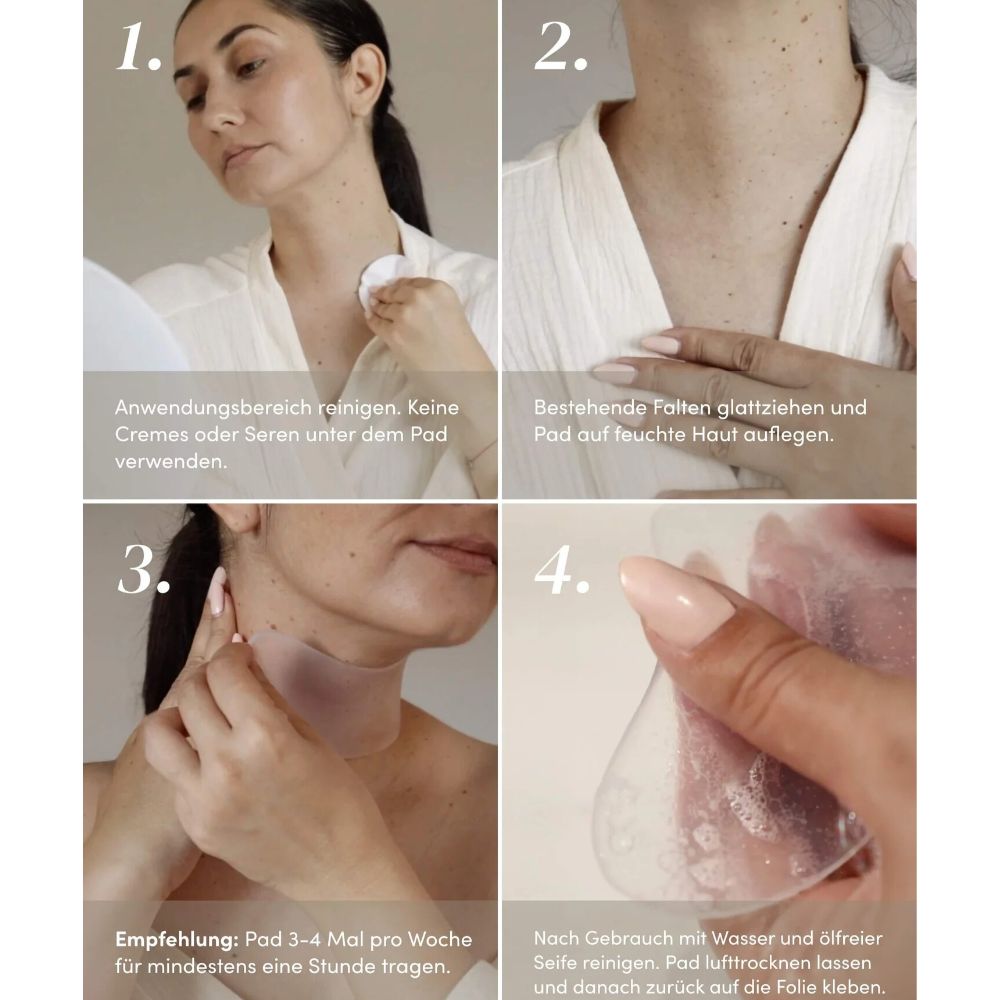 Reinige deine Haut gründlich – sie sollte leicht feucht sein. Glätte bestehende Fältchen mit den Fingern, ohne Falten einzukleben. Platziere das Pad auf dem Halsbereich und verwende keine zusätzlichen Cremes oder Seren darunter. Trage das Pad regelmäßig für mindestens eine Stunde – idealerweise täglich. Nach jeder 2.–3. Anwendung mit lauwarmem Wasser und ölfreier Seife reinigen. Anschließend auf der Folie lufttrocknen lassen, um die Haftkraft zu erhalten.