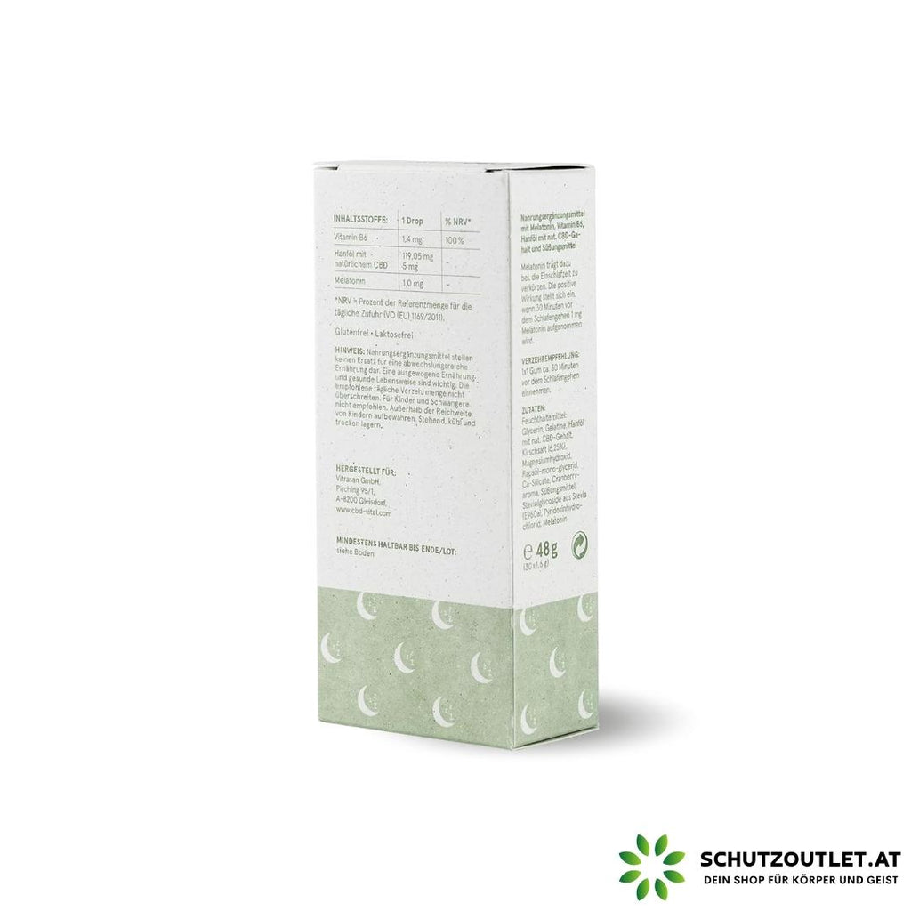 30 Gummidrops mit Kirschgeschmack und 150 mg natürlichem CBD-Gehalt zum Herausdrücken verkürzen die Einschlafzeit und sind ideal für unterwegs. Melatonin, das Schlafhormon, wird vom Körper selbst bei Dunkelheit gebildet. Mit steigender Melatonin-Konzentration erhöht sich die Müdigkeit. Jedes CBD Drops enthält 1 mg Melatonin und trägt damit dazu bei, die Einschlafzeit zu verkürzen.