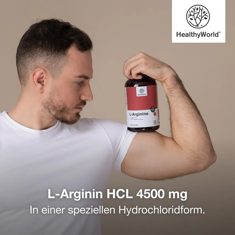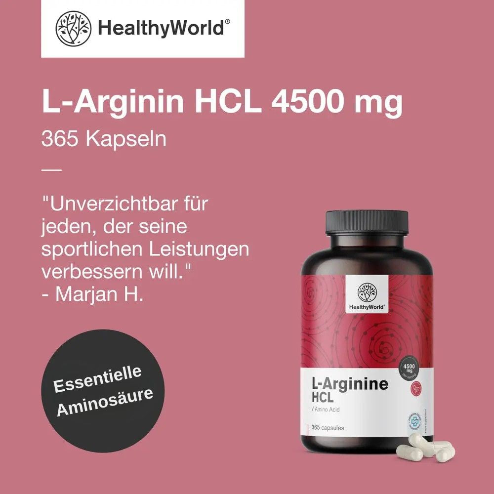 HealthyWorld L-Arginin HCL 4500 mg liefert die essentielle Aminosäure L-Arginin in Hydrochlorid-Form (HCL) zur gezielten Ergänzung der täglichen Ernährung. L-Arginin ist eine proteinogene Aminosäure, die natürlicherweise im menschlichen Körper vorkommt und Bestandteil verschiedener Stoffwechselprozesse ist.