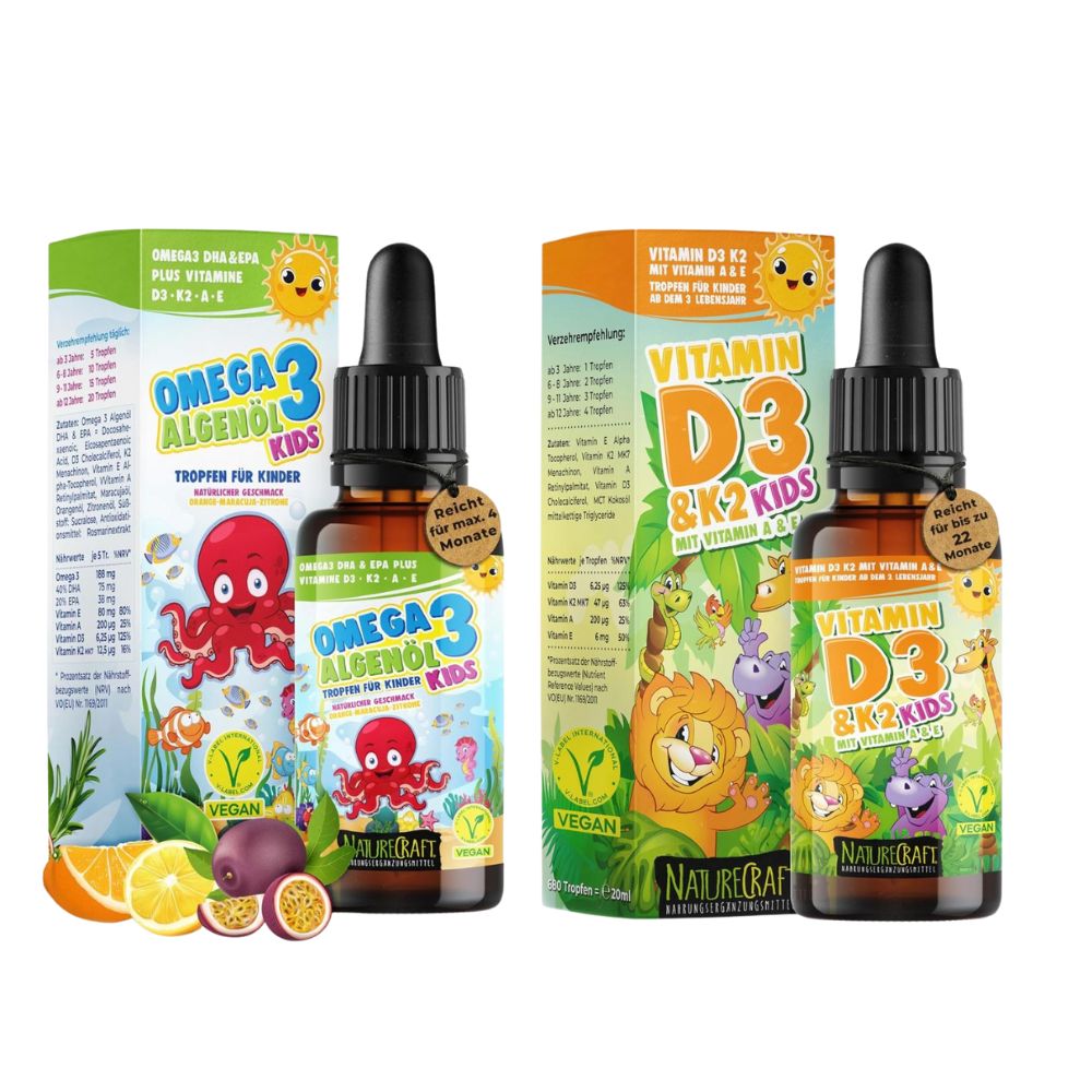Das NatureCraft Kinder-Vital-Set kombiniert zwei essentielle Nährstoffe für die gesunde Entwicklung von Kindern: wertvolle Omega-3-Fettsäuren aus reinem Algenöl sowie Vitamin D3 und K2 in einer praktischen Tropfenform. Beide Produkte sind vegan, kindgerecht dosiert und lassen sich unkompliziert in den Alltag integrieren. Die flüssige Form ermöglicht eine einfache Anwendung – ohne Kapseln, perfekt für Familien.