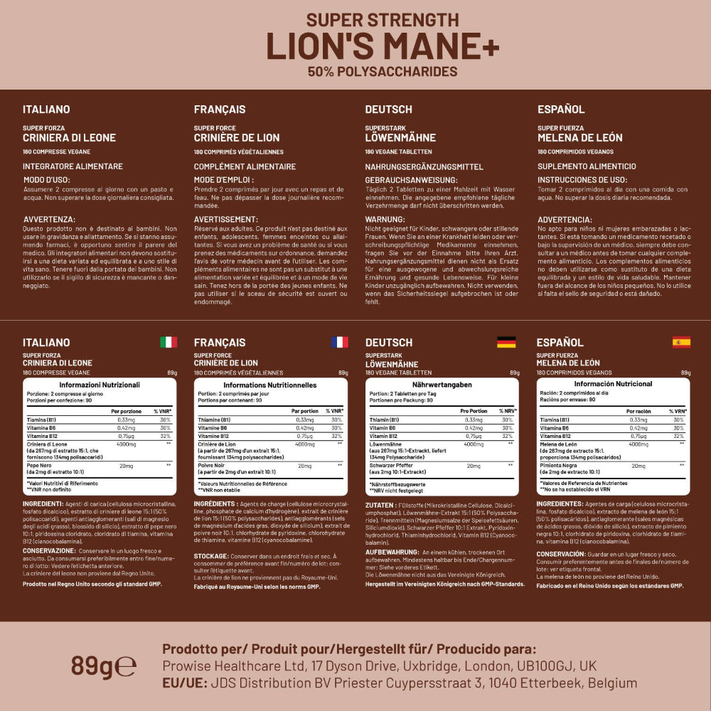 Füllstoffe (Mikrokristalline Cellulose, Dicalciumphosphat), Löwenmähne-Extrakt 15:1 (50% Polysaccharide), Trennmittel (Magnesiumsalze der Speisefettsäuren, Siliciumdioxid), Schwarzer Pfeffer Extrakt 10:1, Pyridoxinhydrochlorid (Vitamin B6), Thiaminhydrochlorid (Vitamin B1), Vitamin B12 (Cyanocobalamin).