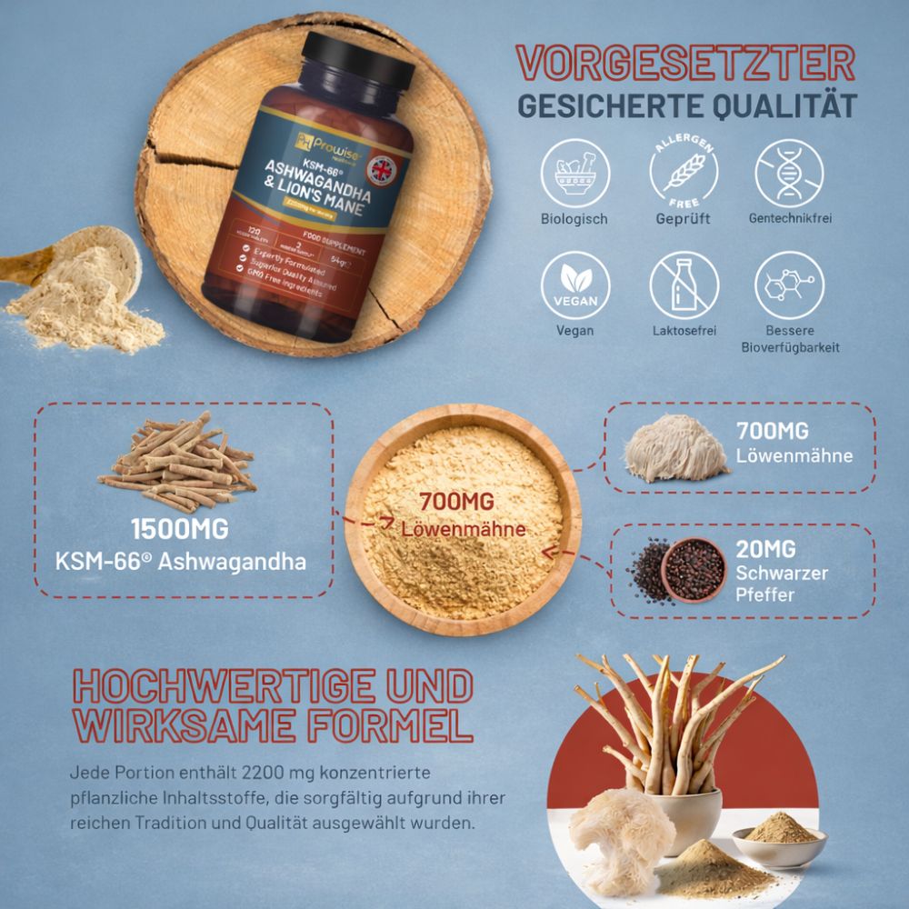 Prowise Healthcare KSM-66® Ashwagandha & Löwenmähne ist ein hochwertiges Nahrungsergänzungsmittel auf pflanzlicher Basis, das zwei sorgfältig ausgewählte Pflanzenextrakte in einer ausgewogenen Tagesformel kombiniert. Jede Portion liefert standardisierten KSM-66® Ashwagandha-Wurzelextrakt sowie konzentrierten Löwenmähnen-Pilzextrakt und ergänzt diese mit schwarzem Pfefferextrakt.