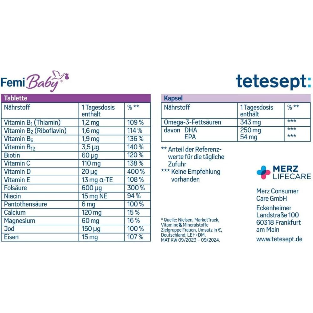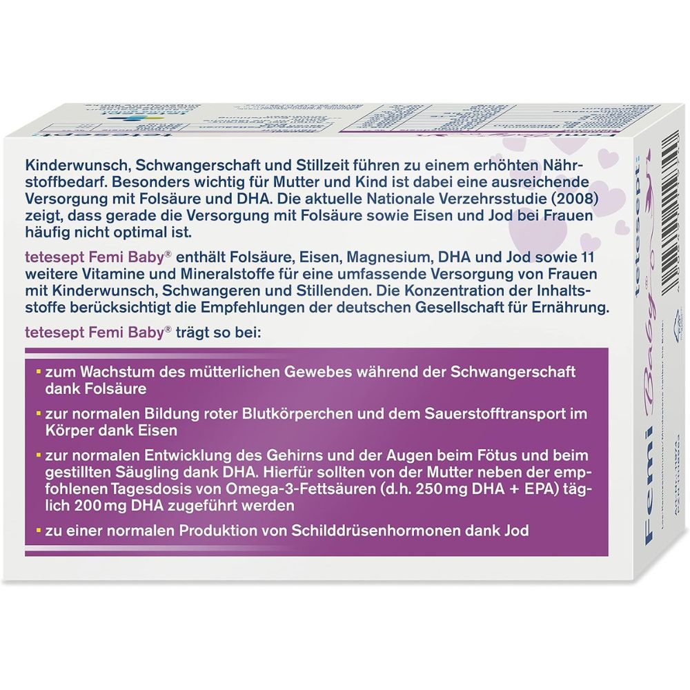 tetesept Femi Baby® enthält Folsäure, Eisen, Magnesium, DHA und Jod sowie 11 weitere Vitamine und Mineralstoffe für eine umfassende Versorgung von Frauen mit Kinderwunsch, Schwangeren und Stillenden. Die Konzentration der Inhaltsstoffe entspricht den Empfehlungen der deutschen Gesellschaft für Ernährung.