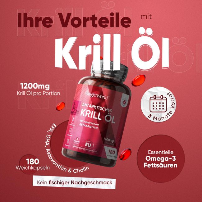 Das WeightWorld Antarktische Krillöl liefert hochwertiges Omega-3 aus nachhaltigem Krillfang in den klaren, kalten Gewässern des Südpolarmeers. Krillöl ist eine natürliche Quelle der Omega-3-Fettsäuren Eicosapentaensäure (EPA) und Docosahexaensäure (DHA), die in Form von Phospholipiden vorliegen und dadurch besonders gut bioverfügbar sind.