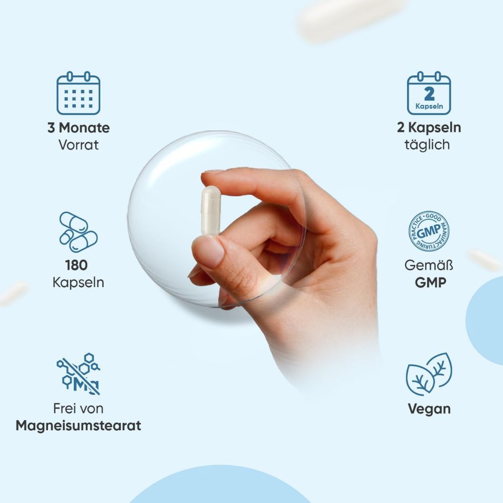 Die veganen Kapseln sind leicht einzunehmen und für eine regelmäßige Anwendung konzipiert. Mit 180 Kapseln pro Dose bietet das Produkt einen praktischen 3-Monats-Vorrat für eine kontinuierliche Versorgung.