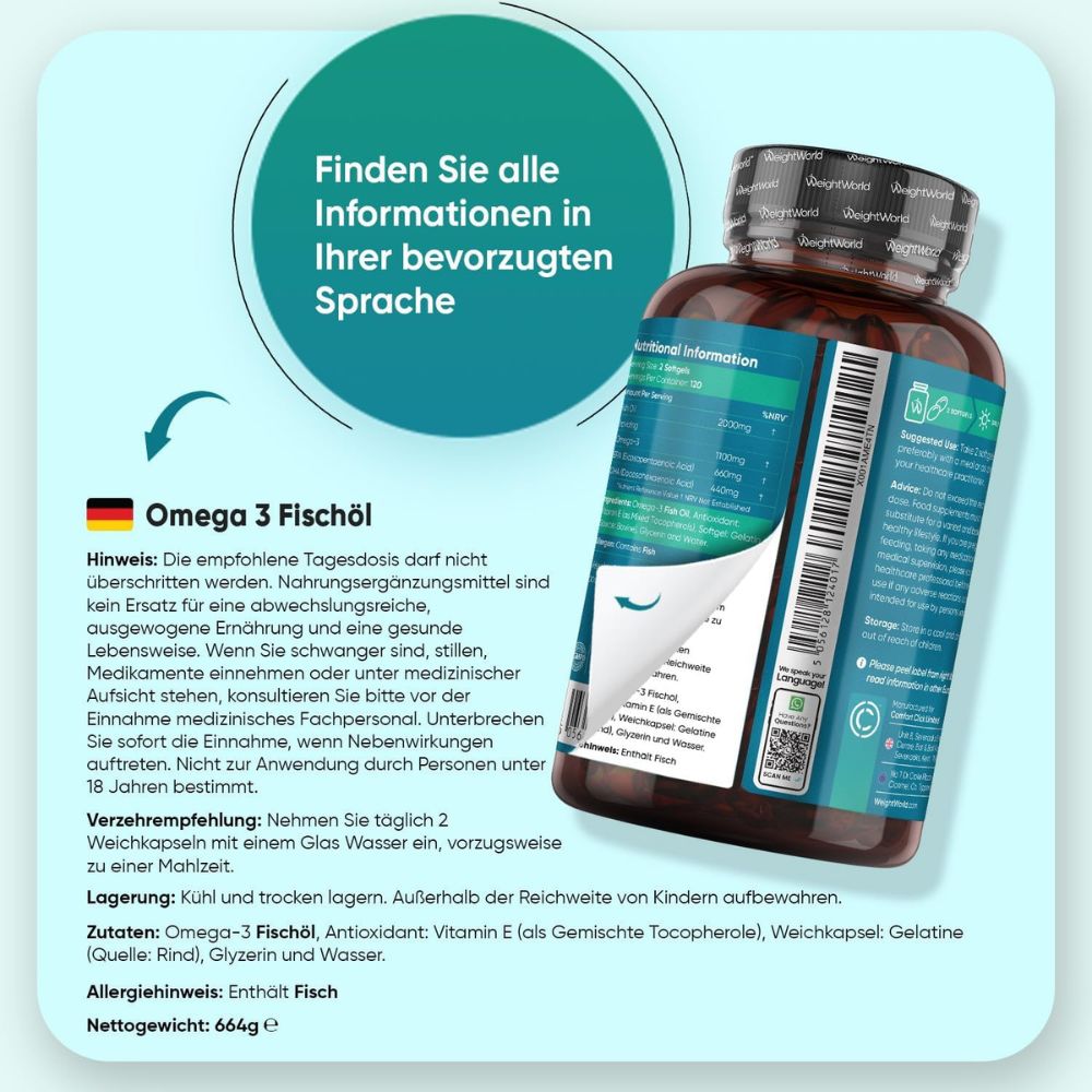 Die WeightWorld Omega-3 Fischöl Weichkapseln liefern eine hochkonzentrierte Quelle essenzieller Omega-3-Fettsäuren aus hochwertigem Fischöl. Die enthaltenen Fettsäuren Eicosapentaensäure (EPA) und Docosahexaensäure (DHA) sind natürliche Bestandteile einer ausgewogenen Ernährung und spielen eine wichtige Rolle für zahlreiche Körperfunktionen.