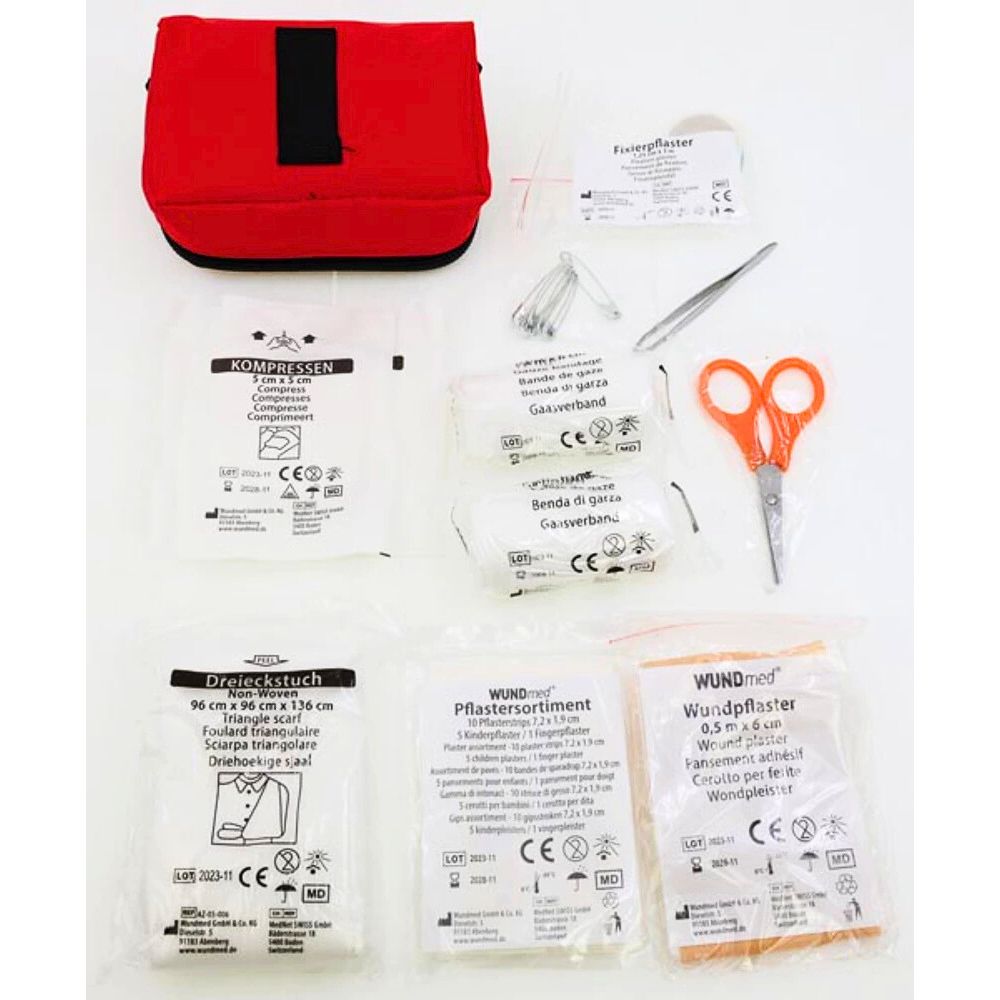 Zur schnellen Erstversorgung kleinerer Verletzungen wie Schnitte, Schürfwunden oder Kratzer. Pflaster, Kompressen oder Mullbinden dienen zur Abdeckung und zum Schutz der betroffenen Hautstelle. Schere, Pinzette und Sicherheitsnadeln erleichtern das hygienische Arbeiten und Fixieren von Verbänden.